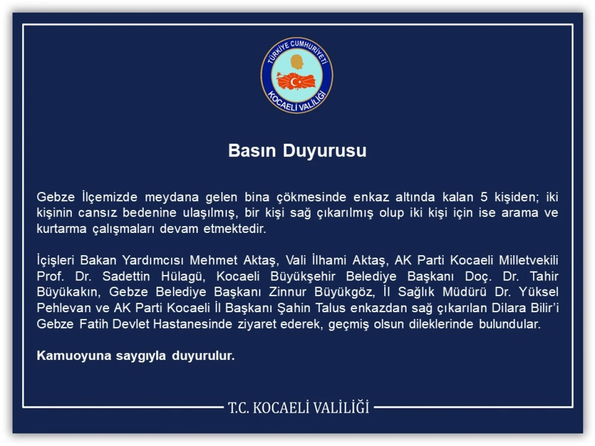 İçişleri Bakan Yardımcısı Mehmet Aktaş, Vali İlhami Aktaş, AK Parti Kocaeli Milletvekili Prof. Dr. Sadettin Hülagü, Kocaeli Büyükşehir Belediye Başkanı Doç. Dr. Tahir Büyükakın, Gebze Belediye Başkanı Zinnur Büyükgöz, İl Sağlık Müdürü Dr. Yüksel Pehlevan ve AK Parti Kocaeli İl Başkanı Şahin Talus enkazdan sağ çıkarılan Dilara Bilir’i Gebze Fatih Devlet Hastanesinde ziyaret ederek, geçmiş olsun dileklerinde bulundular.