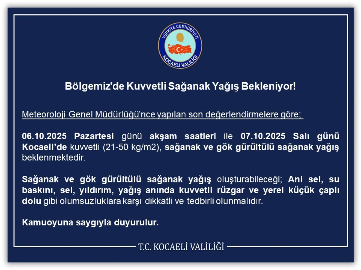 06.10.2025 Pazartesi günü akşam saatleri ile 07.10.2025 Salı günü Kocaeli’de kuvvetli (21-50 kg/m2), sağanak ve gök gürültülü sağanak yağış beklenmektedir.
