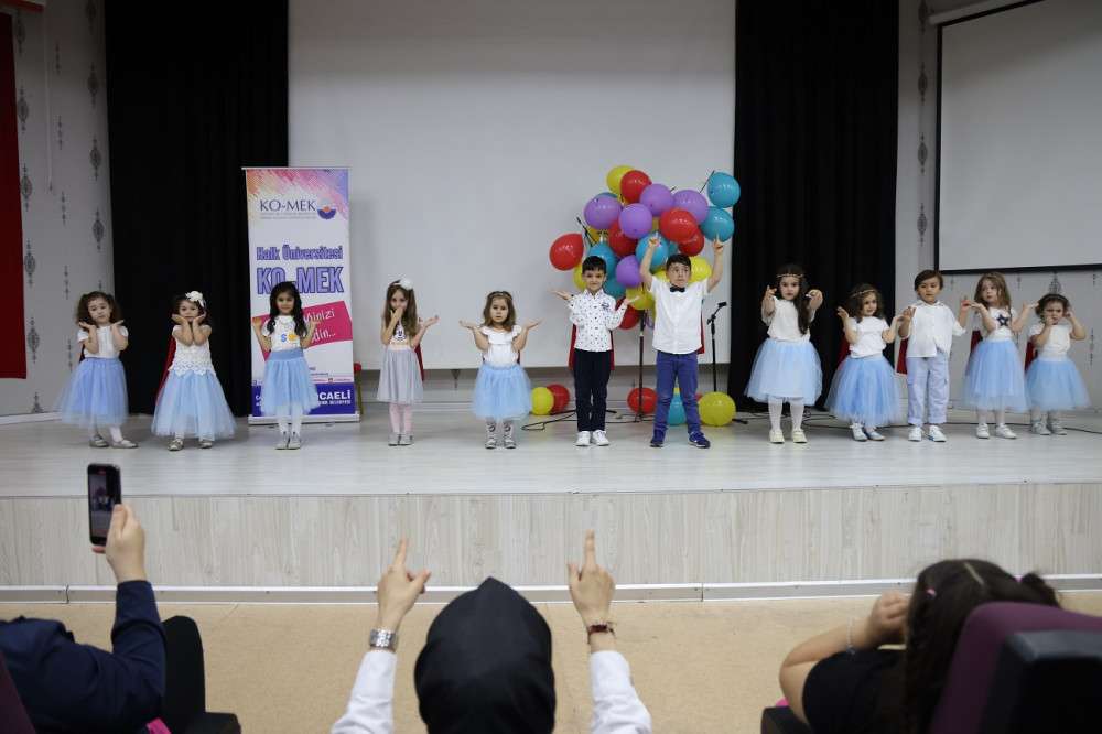 Kocaeli Büyükşehir Belediyesi Meslek ve Sanat Eğitim Kursları çocuk oyun odalarında eğitim gören çocukların yıl sonu etkinlikleri devam ediyor. KO-MEK’in özellikle kursiyer annelerin gözü arkada kalmasın diye kurs merkezleri içinde oluşturan Çocuk Oyun Odalarına gelen miniklerin yıl sonu gösterileri anne babalarına duygu dolu anlar yaşattı. Bu kapsamda Köseköy KO-MEK Kurs Merkezi’nde düzenlenen yılsonu etkinliğinde sahne alan minikler birbirinden güzel gösterileri ile anne babalarından bolca alkış aldı.