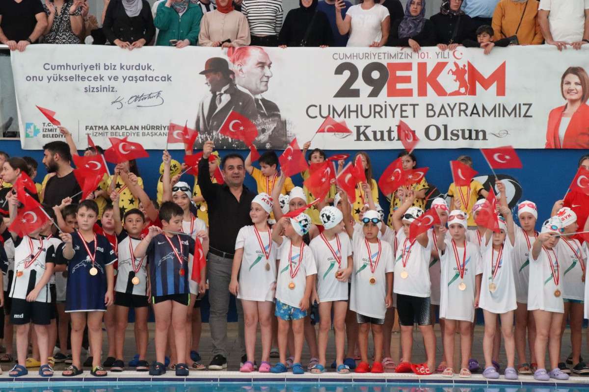 İzmit Belediyesinin Cumhuriyetimizin kuruluşunun 101’inci yılı nedeniyle düzenlediği 29 Ekim Cumhuriyet Bayramı yüzme yarışlarında minik yüzücüler kıyasıya mücadele etti