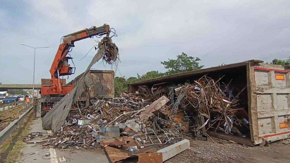 Kocaeli’nin Gebze ilçesinde hurda yüklü tır virajı alamayarak yan yattı. Kaza sebebiyle sürücü yaralanırken hurdalar yola saçıldı. Trafik 3 saat kapalı kalırken karşı şeritte olayı izleyen 2 araç sürücüsü kaza yaptı.