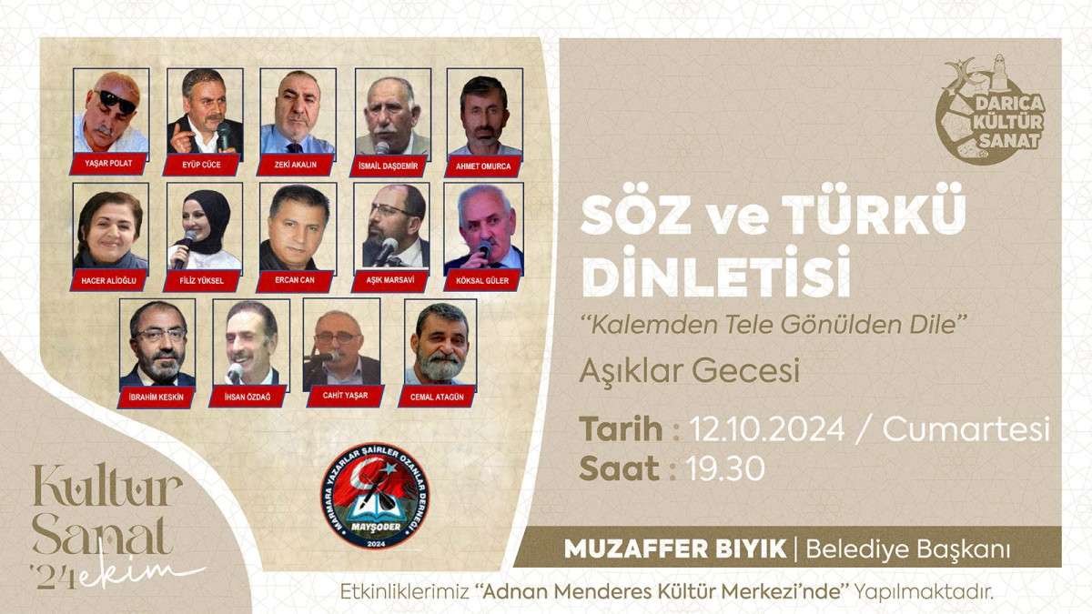 Darıca Belediyesi, kültürümüzün önemli bir parçası olan aşıklık geleneğini yaşatmak amacıyla Aşıklar Şöleni düzenliyor. 12 Ekim Cumartesi günü saat 19.30’da gerçekleşecek etkinliğe tüm Darıcalılar davet edildi.
