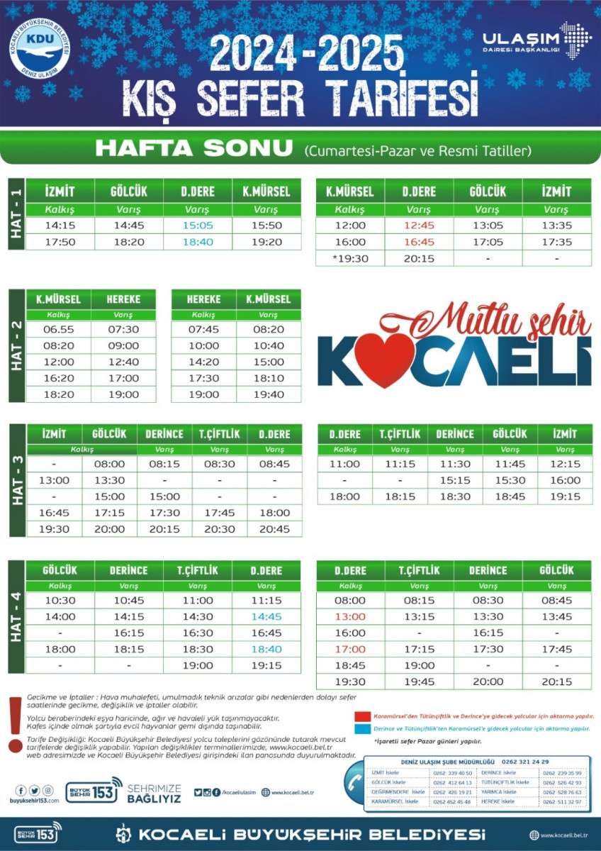 Hat 1 İzmit Gölcük, Değirmendere, Karamürsel, Hat 2, Karamürsel – Hereke güzergâhında, Hat 3. İzmit – Gölcük – Derince – T.Çiftlik – Değirmendere güzergâhında ve Hat 4. Gölcük – Derince – T.Çiftlik – Değirmendere arasında gidiş dönüş olarak 16 Eylül 2024 Pazartesi gününden itibaren deniz ulaşımında kış tarifesine geçecek. Deniz ulaşımında kış sefer tarifesi, Kocaeli Büyükşehir Belediyesi’nin www.kocaeli.bel.tr internet sitesinde Vapur Saatleri linkinden, kdu.kocaeli.bel.tr adresinden ve e-komobil üzerinden takip edilebilecek.