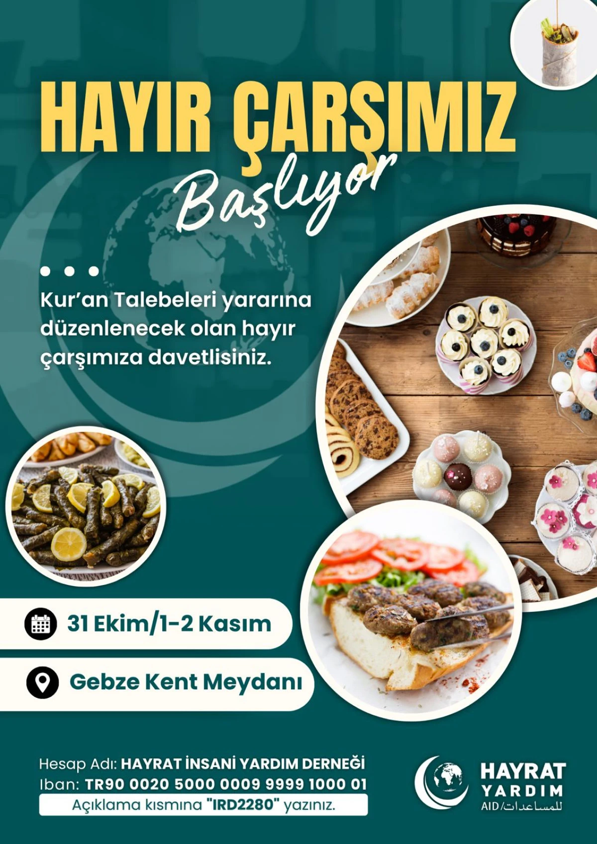 Hayrat İnsani Yardım Derneği öncülüğünde düzenlenecek olan Hayır Çarşısı, Kur’an talebelerine destek amacıyla 31 Ekim–2 Kasım tarihleri arasında Gebze Kent Meydanı’nda gerçekleştirilecek.