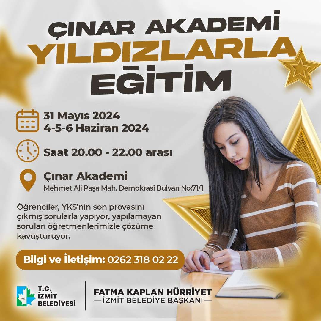 Eğitimde fırsat eşitliği sunan İzmit Belediyesi Çınar Akademi, 8-9 Haziran tarihlerinde YKS’ye girecek olan öğrencilerin tamamen derslere odaklanacağı 4 günlük özel bir program düzenleyecek