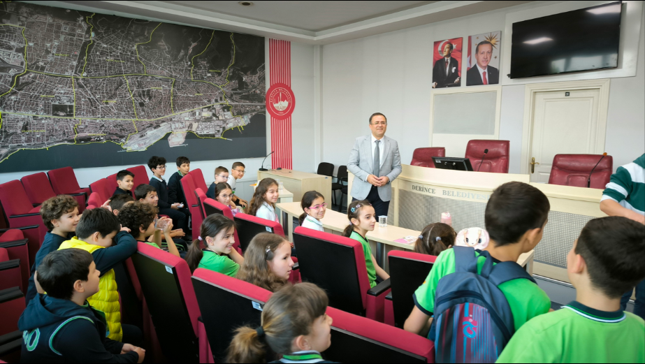 Derince Belediye Başkanı Av. Sertif Gökçe, bu kez Nesibe Aydın Eğitim Kurumları Kocaeli Kampüsü’nden öğrencileri konuk etti. Derince Belediyesi Meclis Salonu’nda gerçekleşen görüşmede Başkan Gökçe, Nesibe Aydın Eğitim Kurumları Kocaeli Kampüsü sınıf öğretmenleri Ayhan Güler, Merve Çetin, Ezgi Özsu, İngilizce öğretmenleri Didem Üliç ve Furkan Türk ile 3. sınıf öğrencilerini konuk etti. Nesibe Aydın Eğitim Kurumları 3. sınıf öğretmenlerinin PYP temelli eğitimleri kapsamında "Şehirlerdeki sistemler toplulukların ihtiyaçlarının karşılanmasında etkilidir" ana fikrinden yola çıkarak belediye çalışmaları ile ilgili bilgi edinmek için yaptıkları röportaj kapsamında konuk oldukları Derince Belediye Başkanı Av. Sertif Gökçe önemli bilgiler verdi.
