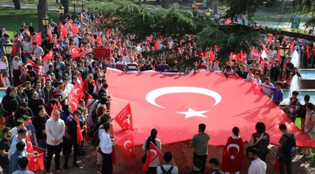 Öğrenciler, kampüs ana giriş kapısında bayraklarla buluştu ve marşlar eşliğinde Rektörlük