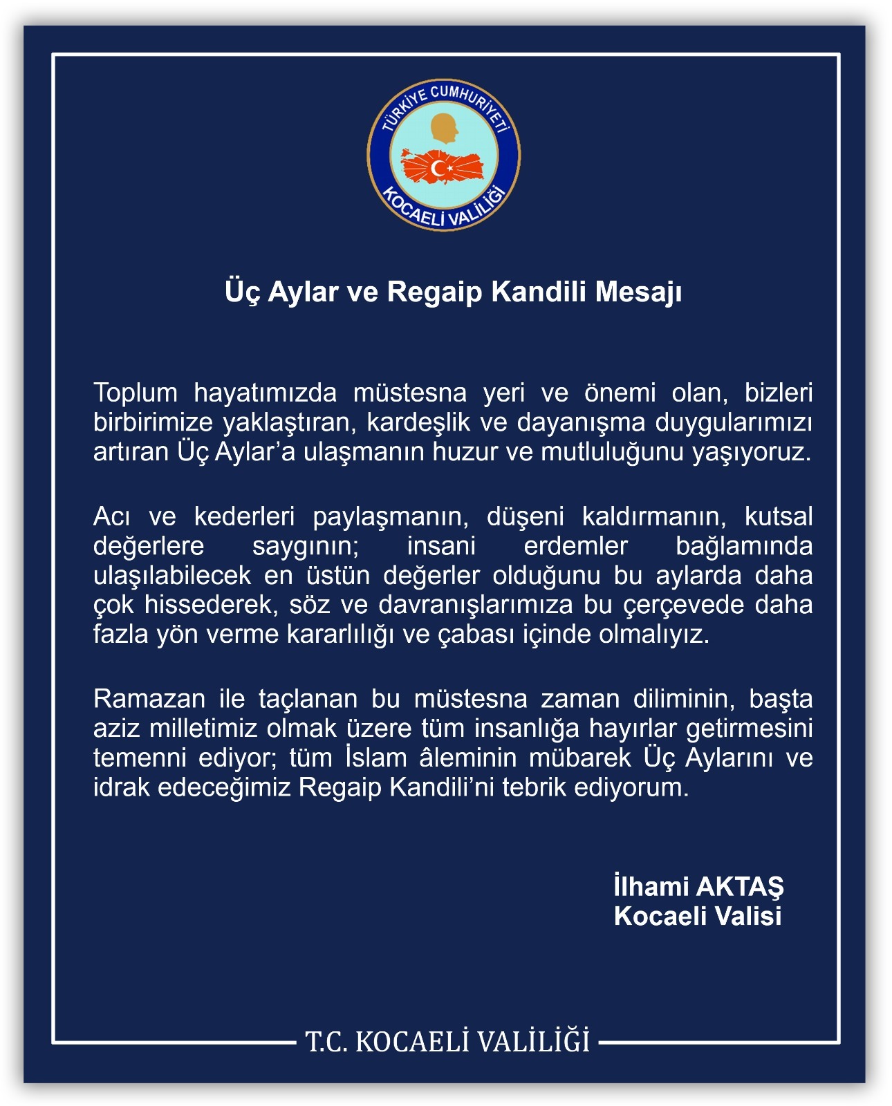 Toplum hayatımızda müstesna yeri ve önemi olan, bizleri birbirimize yaklaştıran, kardeşlik ve dayanışma duygularımızı artıran Üç Aylar’a ulaşmanın huzur ve mutluluğunu yaşıyoruz.
