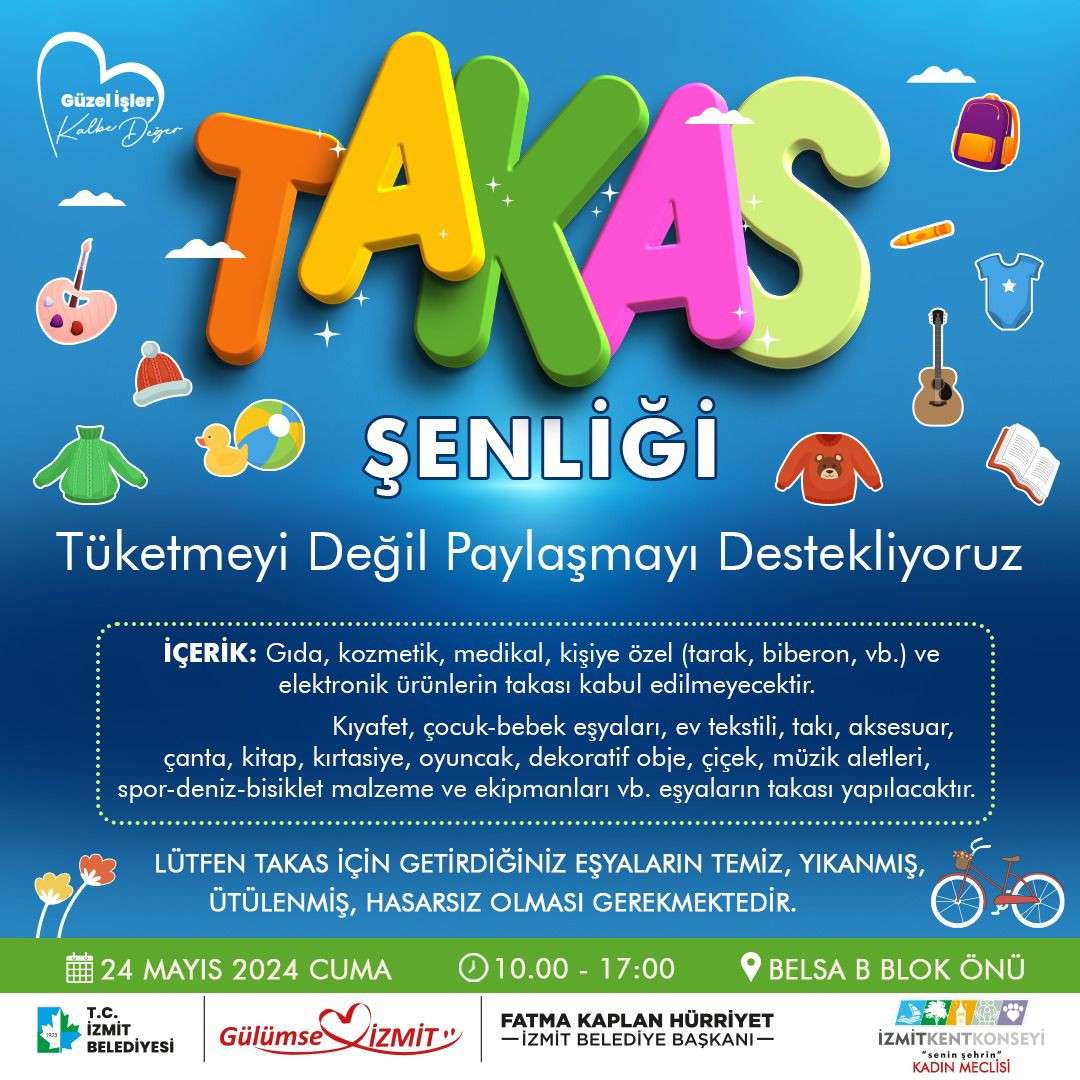 Takas Şenliği’nde; kıyafet, çocuk-bebek eşyaları, ev tekstili, takı, aksesuar, çanta, kitap, kırtasiye, oyuncak, dekoratif obje, çiçek, müzik aletleri, spor-deniz-bisiklet malzeme ve ekipmanları vb. eşyaların takası yapılacak olup gıda, kozmetik, medikal, kişiye özel (tarak, biberon vs.) ve elektronik ürünlerin takası kabul edilmeyecek. Takas için getirilecek eşyaların temiz, yıkanmış, ütülenmiş ve hasarsız olması gerekiyor. İzmit Belediyesi ve Kent Konseyi, tüm vatandaşları bu anlamlı etkinliğe katılarak paylaşım kültürünü desteklemeye davet ediyor.