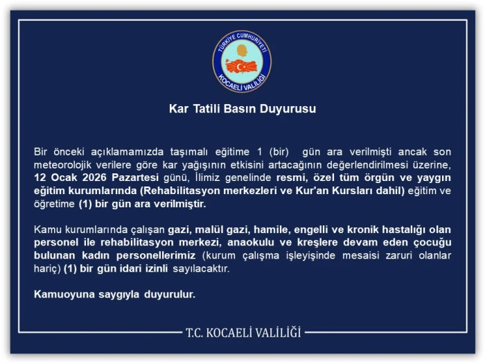 Bir önceki açıklamamızda taşımalı eğitime 1 (bir) gün ara verilmişti ancak son meteorolojik verilere göre kar yağışının etkisini artacağının değerlendirilmesi üzerine, 12 Ocak 2026 Pazartesi günü, İlimiz genelinde resmi, özel tüm örgün ve yaygın eğitim kurumlarında (Rehabilitasyon merkezleri ve Kur'an Kursları dahil) eğitim ve öğretime (1) bir gün ara verilmiştir.