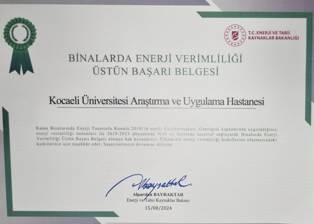Enerji ve Tabii Kaynaklar Bakanı Alparslan Bayraktar imzalı olan Binalarda Enerji Verimliliği Üstün Başarı Belgesi, Kocaeli Üniversitesi'nin enerji verimliliği konusunda yürüttüğü üstün başarıları temsil ediyor. Sadece eğitim ve araştırma alanlarında değil, geliştirdiği çevre dostu projelerle de öncü bir rol üstlenen Kocaeli Üniversitesi, tüm birimleriyle bu anlamda önemli gelişmeler ortaya koyuyor. Başta Araştırma ve Uygulama Hastanesi olmak üzere diğer birimlerde de enerji verimliliği kapsamında geliştirilen projelerle, hem enerji kaynaklarının daha verimli kullanılması sağlanıyor hem de kamu bütçesine önemli katkılar sunuluyor.