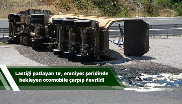 Lastiği patlayan tır, emniyet şeridinde bekleyen otomobile çarpıp devrildi