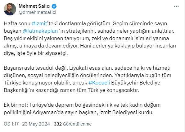 Böylesine zor bir süreçte İzmit Belediyesi ile ortak çalışan Salıcı, elinden geldiğince deprem bölgesi için çalıştı. Bu süreçte Başkan Fatma Kaplan Hürriyet ile de sıkı ilişkiler kuran Salıcı, sosyal medyadan yaptığı açıklamada; “Hafta sonu İzmit’teki dostlarımla görüştüm. Seçim sürecinde sayın başkan Fatma Kaplan Hürriyet’in stratejilerini, sahada neler yaptığını anlattılar. Beş yıldır ekibini yakından tanıyorum; zeki ve donanımlı isimleri yanına almış, almaya da devam ediyor.