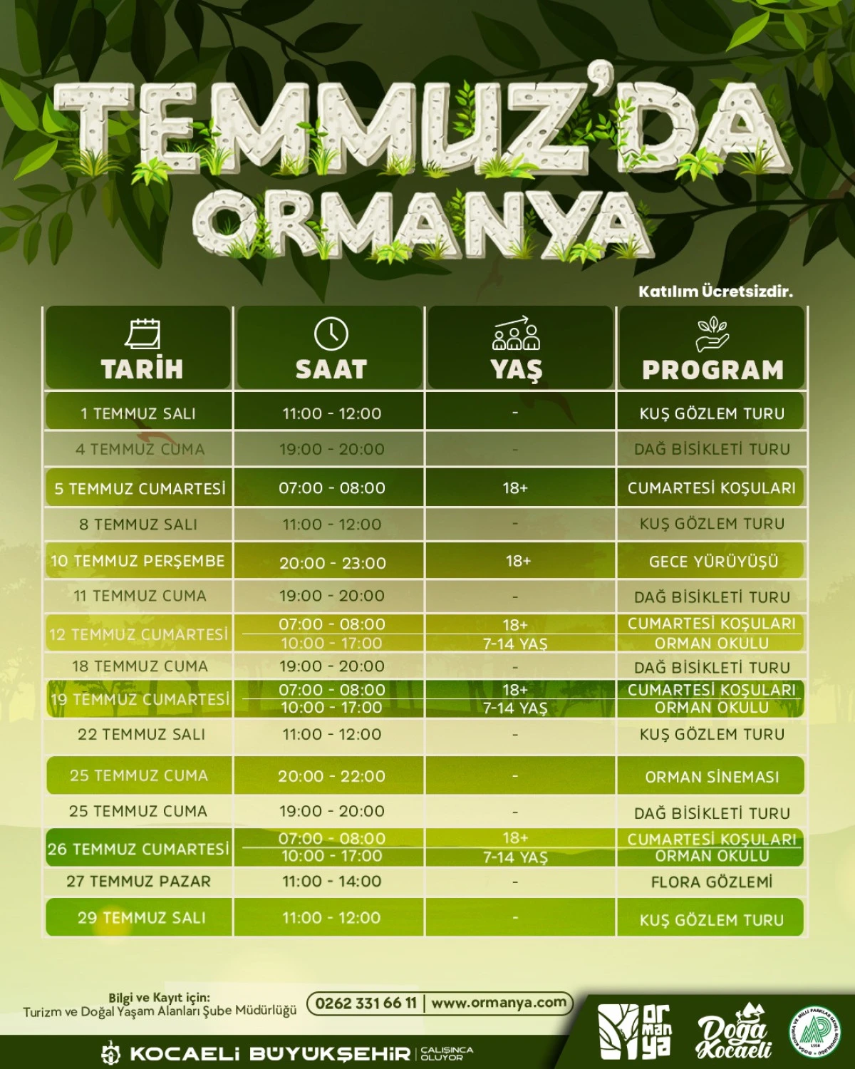 Büyükşehir Belediyesi, Ormanya ve Kuzuyayla’da doğa tutkunları için dolu dolu bir etkinlik takvimi hazırladı. Temmuz ayında gerçekleşecek ücretsiz etkinliklere tüm Kocaelililer davetli.