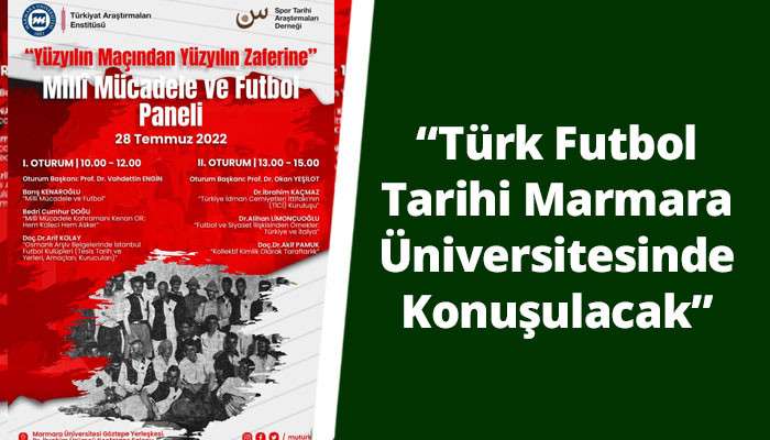 Millî Mücadele’nin Yüzüncü Yılı etkinlikleri kapsamında "Yüzyılın Maçından Yüzyılın Zaferine" Millî Mücadele ve Futbol konulu panel düzenleniyor. Marmara Üniversitesi Türkiyat Araştırmaları Enstitüsü ve Spor Tarihi Araştırmaları Derneği tarafından ortaklaşa organize edilen panel, 28 Temmuz Perşembe günü saat 10.00’da Marmara Üniversitesi Göztepe Yerleşkesi Dr. İbrahim Üzümcü Konferans Salonunda başlayacak.