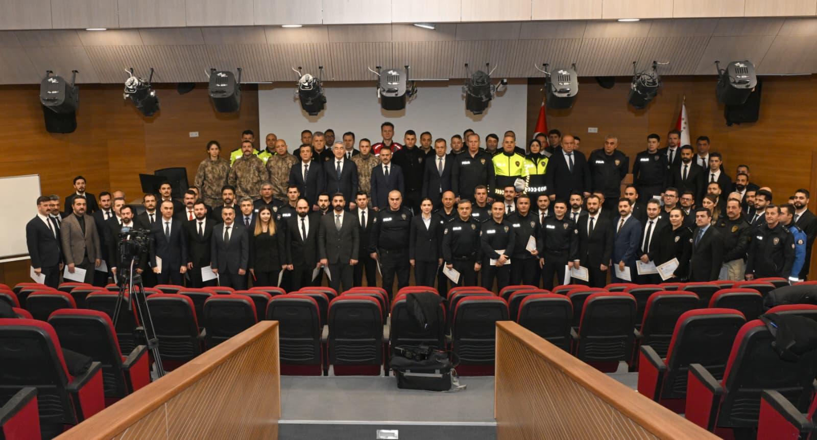 Vali İlhami Aktaş, milletimizin huzur ve güvenliği için fedakârca çalışan bölgedeki asayişin temini ve muhafazasında mesai mefhumu gözetmeksizin görev yapan emniyet personeline Başarı Belgesi takdim ederek teşekkürlerini iletti.