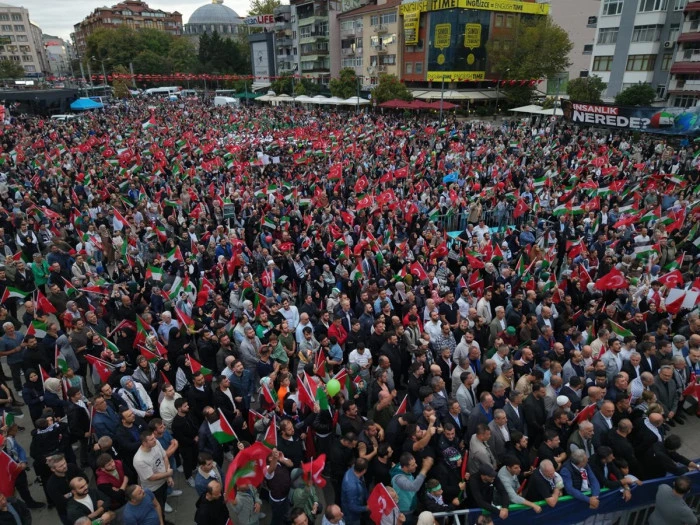Merkez Bankası önünden İzmit Kent Meydanı’na doğru yapılan yürüyüş sonrası düzenlenen mitingde; Gazze, Filistin halkı ve SUMUD Filosuna destek için edilen dualar ve yapılan Kur’an-ı Kerim Tilaveti sonrası video gösterimleri gerçekleşti.