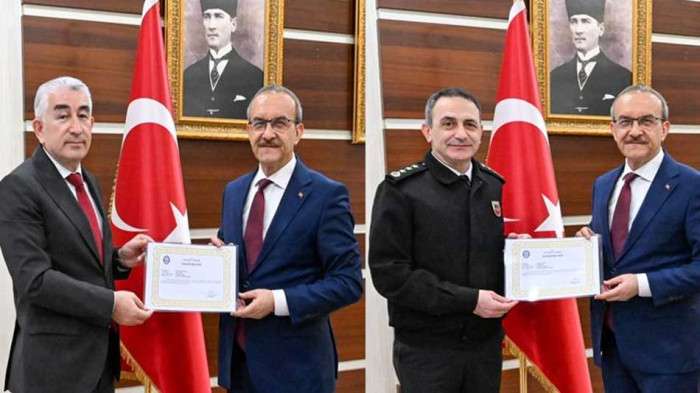 Kocaeli Valisi Seddar Yavuz seçimlerde büyük fedakarlıkla huzur ve güveni sağlayan İl Emniyet Müdürü Faruk Karaduman ile İl Jandarma Komutanı Albay Murat Bozkurt'u başarı belgesiyle ödülendirdi.